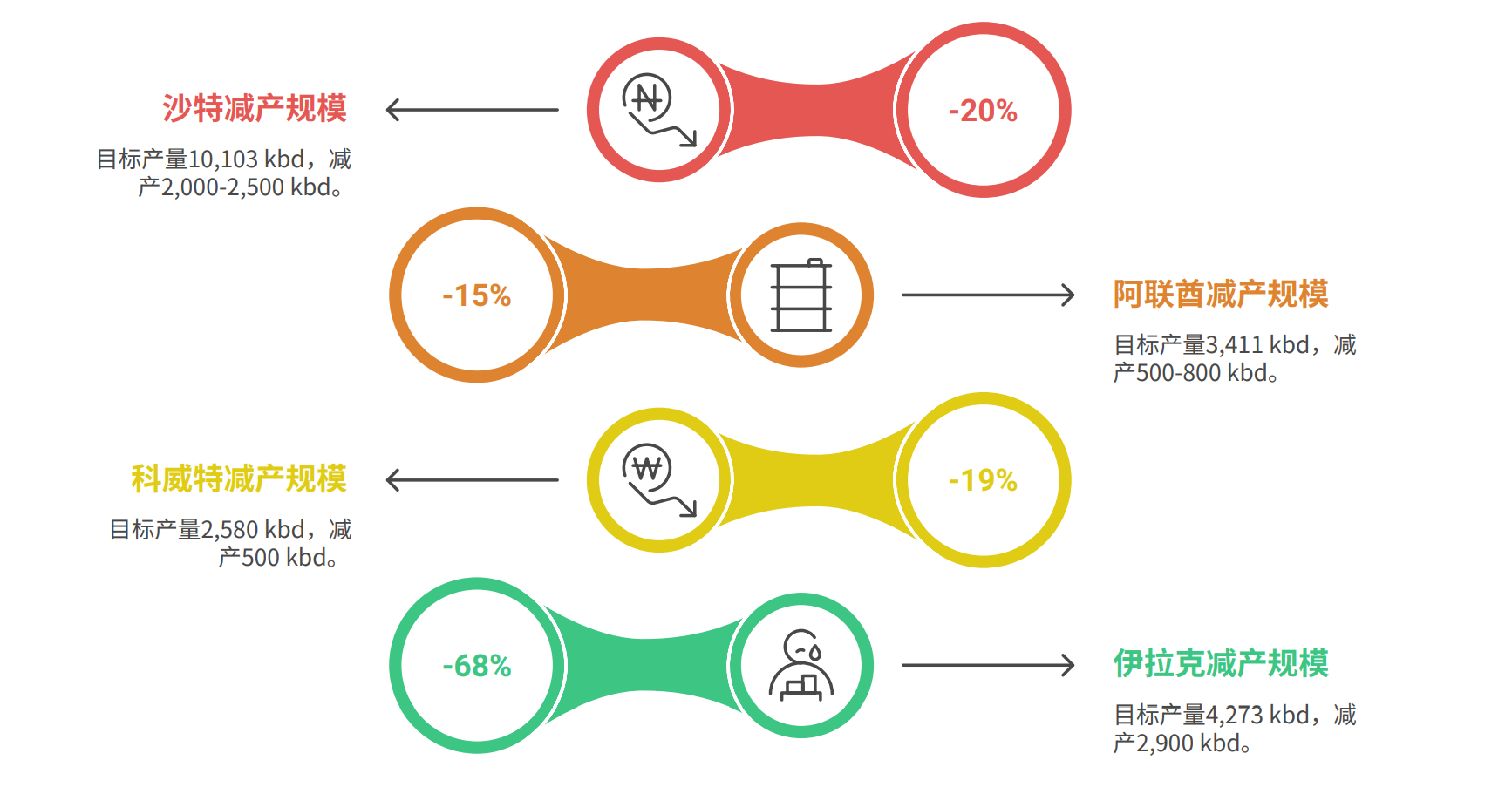 具体而言,沙特的石油日产量减少200万至250万桶,阿联酋减少50万至80万桶,科威特减少约50万桶,伊拉克减少约290万桶。